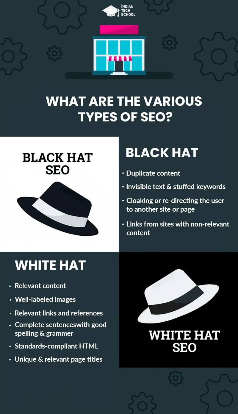 Ans: White hat SEO: The most widespread SEO technique utilizes techniques and methods to increase search engine rankings. White hat SEO uses techniques like link acquisition, high-quality content, restructuring, and website HTML optimization. With White hat SEO, you can expect stable growth in your rankings on Google.
